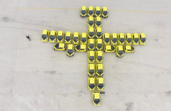 “小黃車”擺放成飛機形狀,屹立在航空園區(qū)內(nèi),甚為壯觀。吸引了多家媒體記者紛紛試駕試駕,記者們試駕之后,對其贊不絕口。