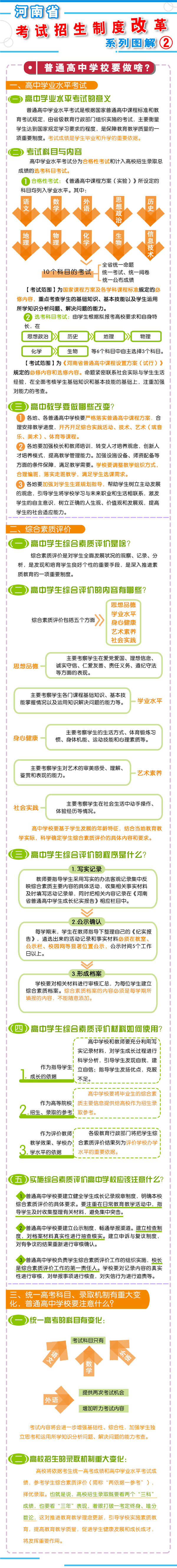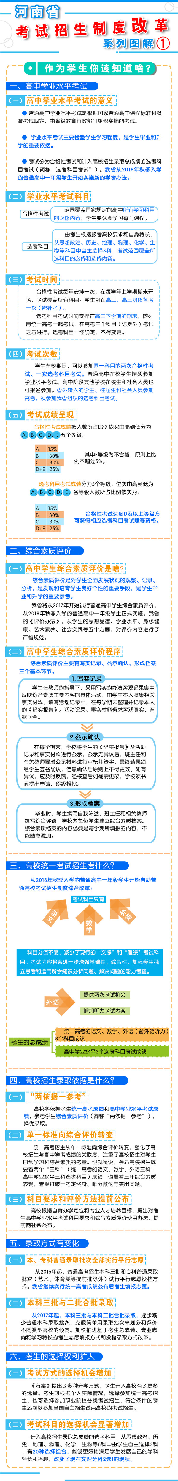 一、促進升學機會公平 逐步增加我省考生接受優(yōu)質(zhì)高等教育的機會,逐步增加農(nóng)村學生升入重點高校人數(shù),減少和規(guī)范高考加分,完善中小學招生辦法?! ?strong>二、改革考試形式和內(nèi)容 完善高中學業(yè)水平考試。考試分為合格性考試和計入高校招生錄取總成績的選考科目考試(簡稱“選考科目考試”)。合格性考試范圍覆蓋國家規(guī)定的高中所有學習科目的必修內(nèi)容。選考科目由考生根據(jù)報考高校要求和自身特長,從思想政治、歷史、地理、物理、化學、生物等科目中自主選擇3科。學生在校期間,可以參加同一科目的兩次合格性考試、一次選考科目考試?! ∵M一步規(guī)范高中學生綜合素質(zhì)評價。建立全省規(guī)范統(tǒng)一的高中學生綜合素質(zhì)檔案,完善學生綜合素質(zhì)評價電子化管理平臺,客觀記錄學生成長過程中的真實表現(xiàn),確保程序嚴格、公開透明、內(nèi)容真實可信。 推進高職院校分類考試。高職院校(含高等??茖W校)考試招生與普通高校相對分開,實行“文化素質(zhì)+職業(yè)技能”評價方式。中職(含技校)畢業(yè)生報考高職院校,參加文化基礎(chǔ)和專業(yè)技能相結(jié)合的測試。普通高中畢業(yè)生報考高職院校,參加職業(yè)適應(yīng)性測試,文化素質(zhì)成績使用高中學業(yè)水平考試成績,參考綜合素質(zhì)評價?! ∩罨荚噧?nèi)容改革。依據(jù)國家高中課程標準和高校人才選拔、培養(yǎng)要求,科學設(shè)計命題內(nèi)容,增強基礎(chǔ)性、綜合性,突出能力、創(chuàng)新導向,著重考察學生獨立思考和運用所學知識分析問題、解決問題的能力?! ?strong>三、改革招生錄取機制 完善招生選拔機制。高校要合理確定考試招生的標準、條件、程序等內(nèi)容,在招生章程中詳細列明并提前向社會公布。要加強學校招生委員會建設(shè),充分發(fā)揮其在重大招生事項中的作用。建立考試錄取申訴機制和招生問責制,校長對錄取結(jié)果負責?! 「母镤浫》绞健?017年起,本科三批與本科二批合批錄取,逐步減少普通本科錄取批次,克服簡單用錄取批次來劃分和評價不同類型高校的傾向。加快推進基于考生總成績、專業(yè)志向和學習特長的考生志愿填報方式和投檔錄取方式改革?! ?strong>四、改革監(jiān)督管理機制 加強信息公開,全面實施高校招生“陽光工程”,進一步擴大信息公開的范圍和內(nèi)容。強化考試安全,堅持從嚴治考,完善考試招生誠信制度,落實誠信結(jié)果使用要求。加大違規(guī)查處力度,加強考試招生全程監(jiān)管,嚴厲打擊和嚴肅查處考試招生中的違法違規(guī)行為,及時公布查處結(jié)果,嚴格責任追究?! ?strong>五、2018年秋季開始實施 從2018年秋季入學的普通高中一年級學生開始啟動普通高??荚囌猩贫染C合改革?! ≡诟母锟荚嚳颇吭O(shè)置上,不分文理科,外語科目提供兩次考試機會。考生的總成績由統(tǒng)一高考的語文、數(shù)學、外語(含外語聽力)3個科目成績和高中學業(yè)水平3個選考科目考試成績組成。保持統(tǒng)一高考的語文、數(shù)學、外語分值不變?! ≡诟母镎猩浫C制上,推進基于統(tǒng)一高考成績和高中學業(yè)水平考試成績、參考學生綜合素質(zhì)評價的多元錄取機制改革。高校要根據(jù)自身辦學定位和專業(yè)人才培養(yǎng)目標,提出對考生高中學業(yè)水平考試科目要求和綜合素質(zhì)評價使用辦法,提前向社會公布?! ?016年省教育行政部門出臺普通高中學業(yè)水平考試實施辦法和普通高中學生綜合素質(zhì)評價實施辦法,從2018年秋季入學的普通高中一年級學生開始正式實施?! ?strong>省教育廳文件通知: 1、關(guān)于印發(fā)《河南省普通高中學業(yè)水平考試實施辦法(試行)》的通知 2、關(guān)于印發(fā)《河南省普通高中學生綜合素質(zhì)評價實施辦法(試行)》的通知