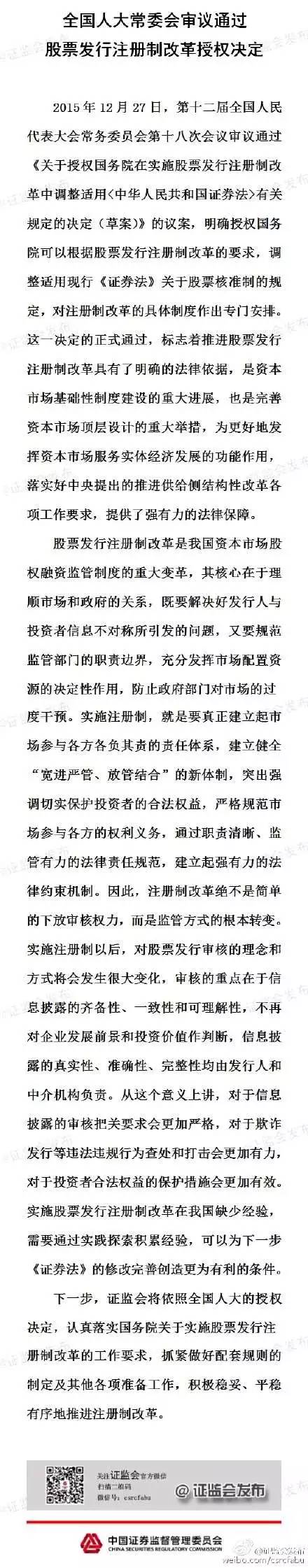 證監(jiān)會(huì)官方微博27日傍晚發(fā)布信息,稱(chēng)全國(guó)人大常委會(huì)審議通過(guò)股票發(fā)行注冊(cè)制改革授權(quán)決定,下一步,證監(jiān)會(huì)將積極穩(wěn)妥、平穩(wěn)有序地推進(jìn)注冊(cè)制改革。