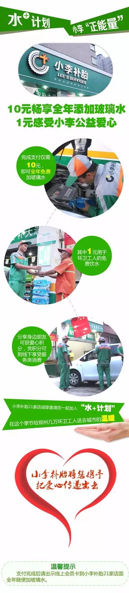 為了讓更多城市建設(shè)者們有一個安全飲水的固定場所,發(fā)揮車主自身的愛心,為創(chuàng)造'鄭州藍'的環(huán)衛(wèi)工人提供一個健康,便捷的飲用水領(lǐng)取站。河南經(jīng)濟廣播聯(lián)合小李補胎特推出“水+計劃”愛心公益活動,車主只需10元即可暢享全年添加玻璃水 ,小李補胎連鎖會從每10元中拿出1元建立環(huán)衛(wèi)工人免費領(lǐng)水站。