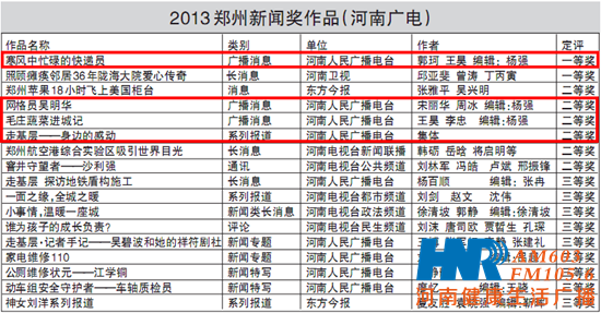 首屆“鄭州新聞獎”在北京評審,評委會對參評作品進(jìn)行了認(rèn)真細(xì)致的評議,經(jīng)過初評、定評共評出特等獎3篇、一等獎14篇、二等獎30篇、三等獎42篇。頒獎會對獲獎?wù)哳C發(fā)了證書和獎杯,并給予一等獎5000元、二等獎3000元、三等獎2000元的獎勵。河南人民廣播電臺報送的作品以新聞性強(qiáng)、主題重大、思想深刻、制作精良、廣播特色突出而獲評委好評。其中河南電臺信息廣播郭珂、王昊采寫的消息《寒風(fēng)中忙碌的快遞員》,通過對鄭州市一名普通快遞員劉師傅的跟隨式采訪,將他真實的工作狀態(tài)和內(nèi)心世界一一展現(xiàn),生動、感人,獲得了一等獎;《網(wǎng)格員吳明華》、《毛莊蔬菜進(jìn)城記》、《走基層——身邊的感動》 3 件作品獲得二等獎;《走基層 探訪地鐵盾構(gòu)施工》等5件作品獲得三等獎。河南電臺信息廣播記者郭珂作為獲獎記者代表在頒獎會上發(fā)了言,表示要按照河南臺的要求和安排,進(jìn)一步轉(zhuǎn)變作風(fēng),寫出面貌一新、聽眾喜聞樂見、無愧于偉大時代的作品來。
