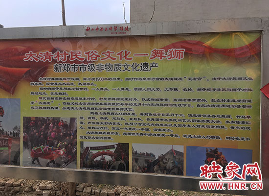 太清村村主任王會甫介紹,他們村的舞獅、舞龍表演,始于1900年前的漢代。明代首相(首輔)高拱在新春巡視太清村時,村民組織高規(guī)格的舞龍、舞獅表演隊(duì)來歡迎首輔,規(guī)格很高。高拱非常高興,當(dāng)場在村里的太清觀前題詞。百姓們?yōu)榱思o(jì)念高拱在新春巡視,就把每年的正月十六定為舞獅的傳統(tǒng)節(jié)日。自此,周邊鄰縣都興起了舞獅熱潮,并在正月十六這一天匯集到太清村進(jìn)行舞獅表演,延續(xù)至今。太清村的舞獅隊(duì)在2002年獲鄭州市舞獅大賽一等獎。