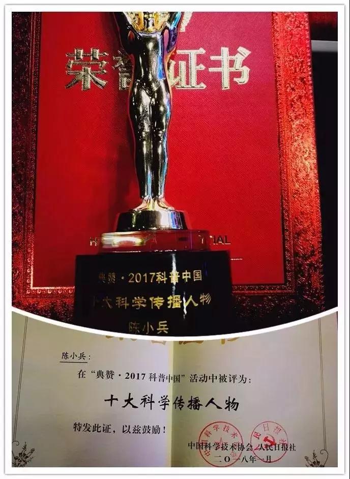陳小兵當(dāng)選“2017年十大科學(xué)傳播人物”,組委會給予他的頒獎詞是,在緊張的臨床工作之余,他熱心醫(yī)學(xué)科普,下基層、走街道、進校園、入社區(qū),腳步走遍中原,做科普講座300余場,受眾十余萬人,積極推廣“預(yù)防為主”的防癌理念,為腫瘤科普殫精竭慮,被譽為“中原腫瘤科普第一人”。