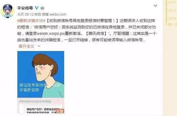 #最新詐騙手法#【收到微信帳號(hào)異地登錄短信時(shí)要警惕!】近期很多人收到這樣的短信:“微信用戶您好:因系統(tǒng)監(jiān)測(cè)到您的已微信在異地登錄,并已關(guān)閉部分功能,請(qǐng)登錄weixin.wxqsi.pw重新激活。【騰訊微信】”。廳哥提醒:這其實(shí)是一個(gè)由偽基站發(fā)來(lái)的詐騙短信,一旦打開(kāi)鏈接,很有可能被誘導(dǎo)輸入微信帳號(hào)、微信密碼、支付密碼、驗(yàn)證碼等,后果不堪設(shè)想……