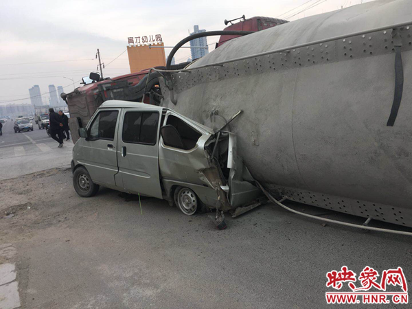 22日上午9時30分左右,江山路與新苑路交叉口東北角,車牌號為豫EX115掛的槽罐車仍然壓在車牌號豫AA817Y的面包車上。槽罐車上裝有40多噸散裝水泥,另一輛趕來救援的槽罐車正在將事故車內(nèi)的水泥轉(zhuǎn)移出來。救援的槽罐車司機說,事故發(fā)生時,槽罐車沿江山路由南向北行駛,走到與新苑路交叉口時,面包車沿江山路由北向東左拐。事故路口沒有紅綠燈,大車司機看到面包車后,立即向右打方向,躲避面包車。由于離心力作用,大車向左側(cè)翻,壓在面包車上,將面包車四分之三壓扁,僅剩駕駛室位置。