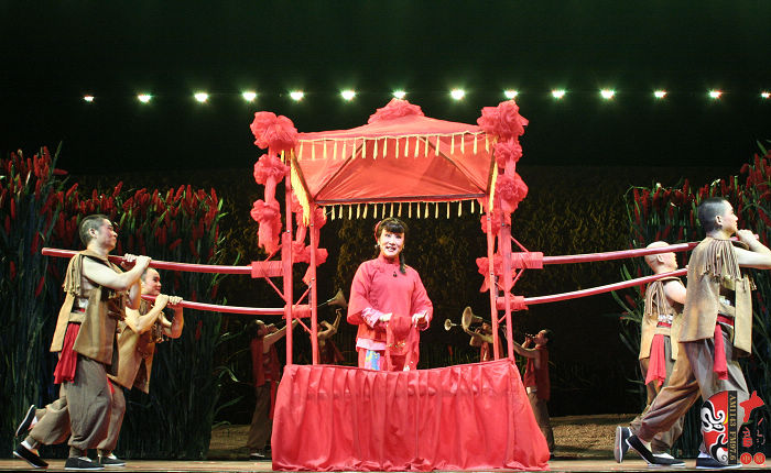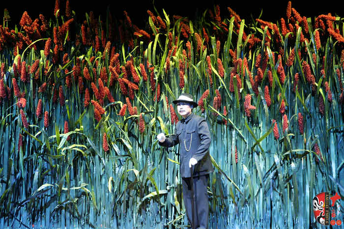 本劇以蓬蓬勃勃、充滿野性、有著旺盛生命力的紅高粱為意像,以九兒和十八刀的愛恨情仇為主線,描繪了上個世紀(jì)三、四十年代,先民們敢愛、敢恨、敢生、敢死的自由精神與生命氣度以及他們對入侵者不惜用鮮血和生命抗?fàn)帯⒖筛杩善直瘔褢K烈的過程。最后九兒用高粱酒做炸藥,引爆了日本人的軍火車,軍火車的爆炸又扎爆了熟透了的高粱米,滿天都飄灑著絢麗的高粱花——這是他們的鮮血之花、靈魂之葩,更是他們精神的升華。