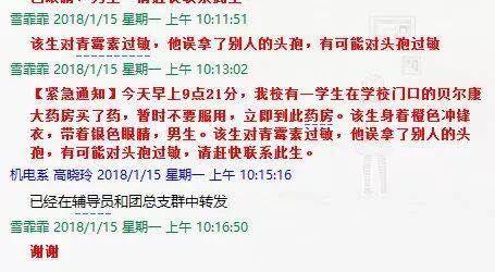 發(fā)布的消息內(nèi)容為:“【緊急通知】今早上9點(diǎn)21分,我校有一學(xué)生在學(xué)校門口的貝爾康大藥房買了藥,該生對(duì)青霉素過(guò)敏,他誤拿了別人的頭孢,有可能對(duì)頭孢過(guò)敏,請(qǐng)趕快聯(lián)系此生,暫時(shí)不要服用藥品,立即到此藥房。該生身著橙色沖鋒衣,戴銀色眼鏡,男生?!?/p>
