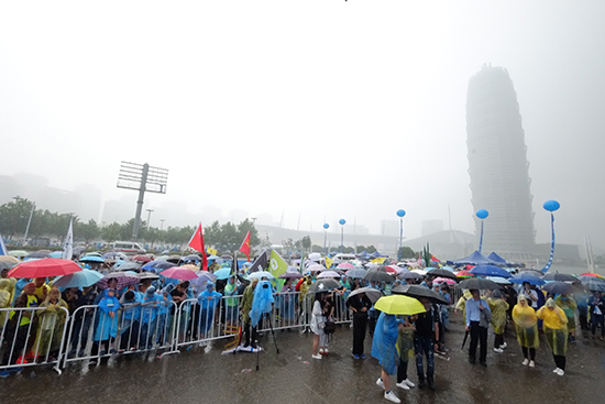 就在活動(dòng)即將開(kāi)始的時(shí)候,突然下起了瓢潑大雨,工作人員第一時(shí)間開(kāi)始發(fā)放雨衣、雨傘,而市民朋友在穿上雨衣后,有序的站在臺(tái)下,等待著活動(dòng)的開(kāi)始。