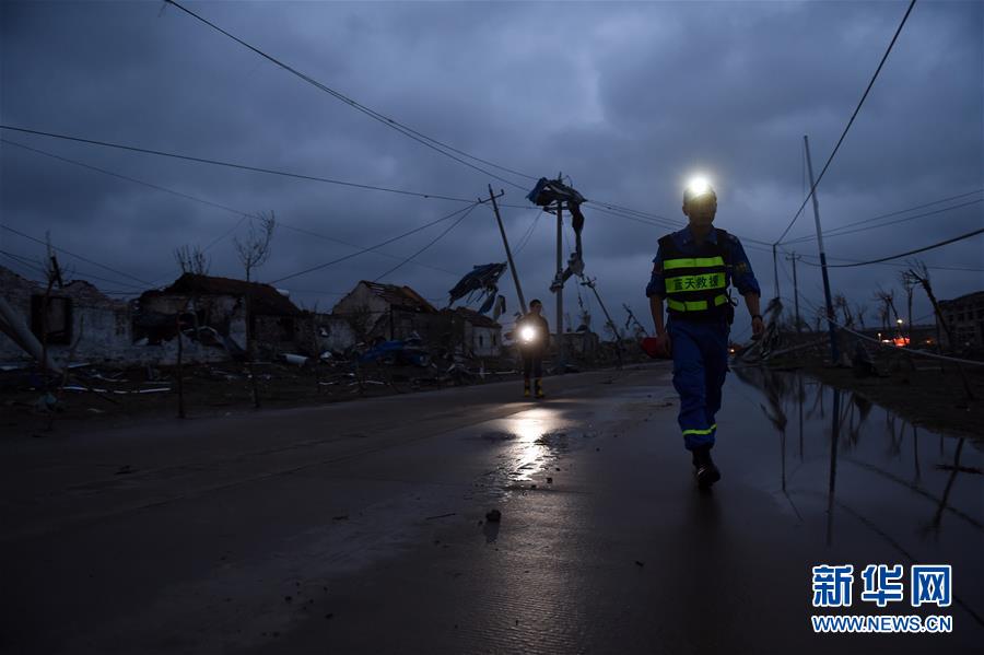 6月24日黎明,搜救人員在鹽城市阜寧經(jīng)濟(jì)開發(fā)區(qū)北陳村進(jìn)行排查搜救。新華社記者韓瑜慶攝
